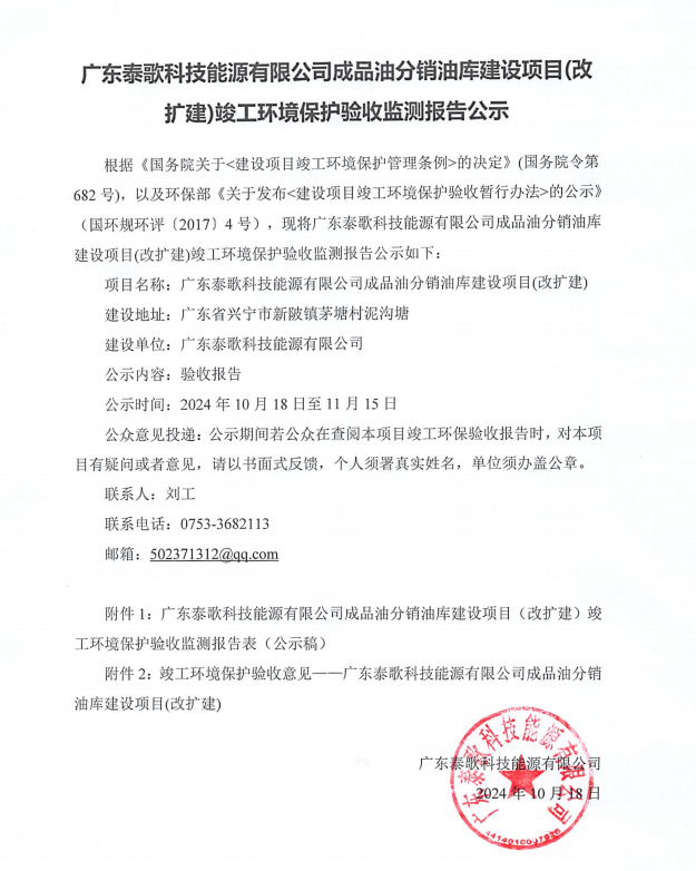 附件1:廣東泰歌科技能源有限公司成品油分銷油庫建設項目(改擴建)竣工環(huán)境保護驗收監(jiān)測報告表(公示稿).pdf附件2:竣工環(huán)境保護驗收意見——廣東泰歌科技能源有限公司成品油分銷油庫建設項目(改擴建).pdf