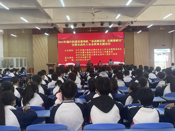 關(guān)愛未成年人安全教育是社會的共同責(zé)任,為了提高廣大未成年人的安全防范意識,促進其健康成長,2023年12月29日下午,福興街道黨工委、辦事處組織社會工作和志愿服務(wù)協(xié)會、社工站、未成年人保護站聯(lián)合興寧市華僑中學(xué)舉辦2023年福興街道黨建領(lǐng)航“奮進新征程·志愿建新功”關(guān)愛未成年人防校園欺凌、防拐騙安全教育主題活動,校方領(lǐng)導(dǎo)德育處副主任黃添清老師、福興街道公用事業(yè)社會保障服務(wù)中心主任朱冬梅出席了活動,德育處副主任黃添清主持,參加安全教育講座約230名學(xué)生。