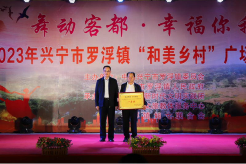 羅浮鎮(zhèn)黨委副書(shū)記、鎮(zhèn)長(zhǎng)葉雄飛(左)、人大主席馮燕妮(右)為獲得二等獎(jiǎng)的隊(duì)伍頒獎(jiǎng)