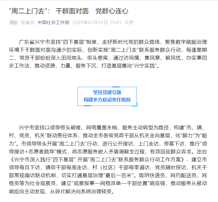 “周二上門去”這一經(jīng)驗成果的發(fā)表,是《中國社會工作報》對興寧創(chuàng)新實踐的權(quán)威認(rèn)可,這篇報道不僅記錄了黨群同心、干群連心的動人故事,更提供了可復(fù)制、可推廣的“興寧方案”。請點擊下方鏈接深入閱讀全文,從中汲取智慧與力量,共同書寫興寧高質(zhì)量發(fā)展新篇章。