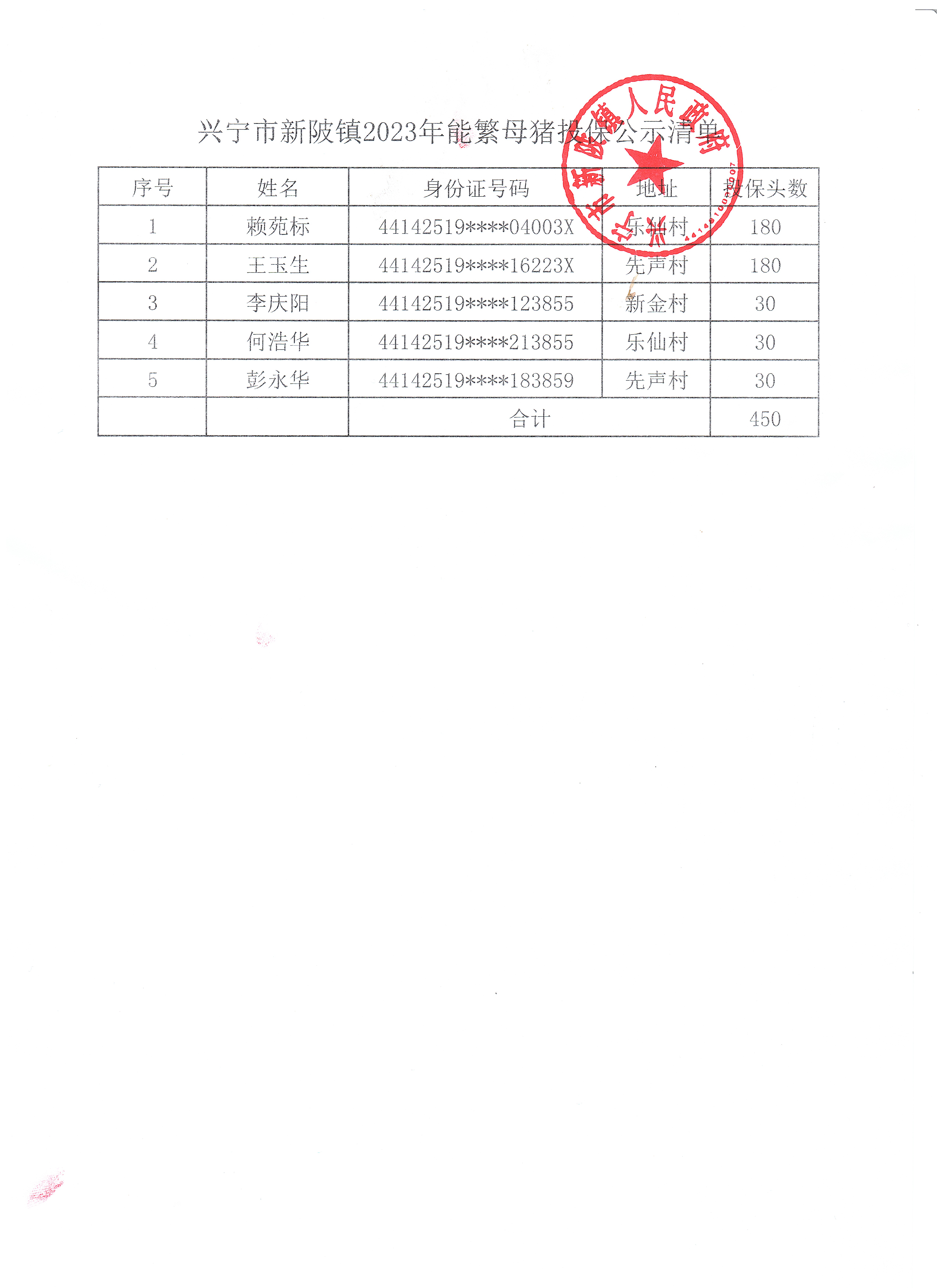 興寧市新陂鎮(zhèn)2023年能繁母豬投保公示清單