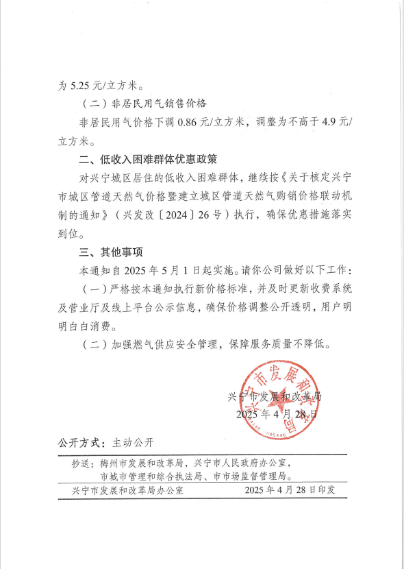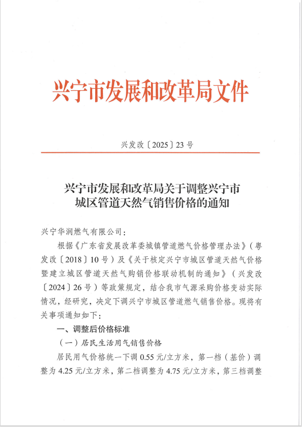 興寧市發(fā)展和改革局關(guān)于調(diào)整興寧市城區(qū)管道天然氣銷售價(jià)格的通知