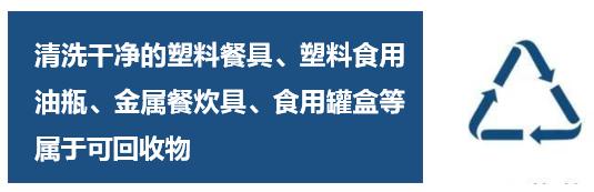 當(dāng)出現(xiàn)塑料餐具、塑料食用油瓶,金屬炊具、食用罐盒等不常產(chǎn)生的可回收物,最好能夠清洗干凈、去除油污,壓扁后與客廳可回收物妥善存放在一起。