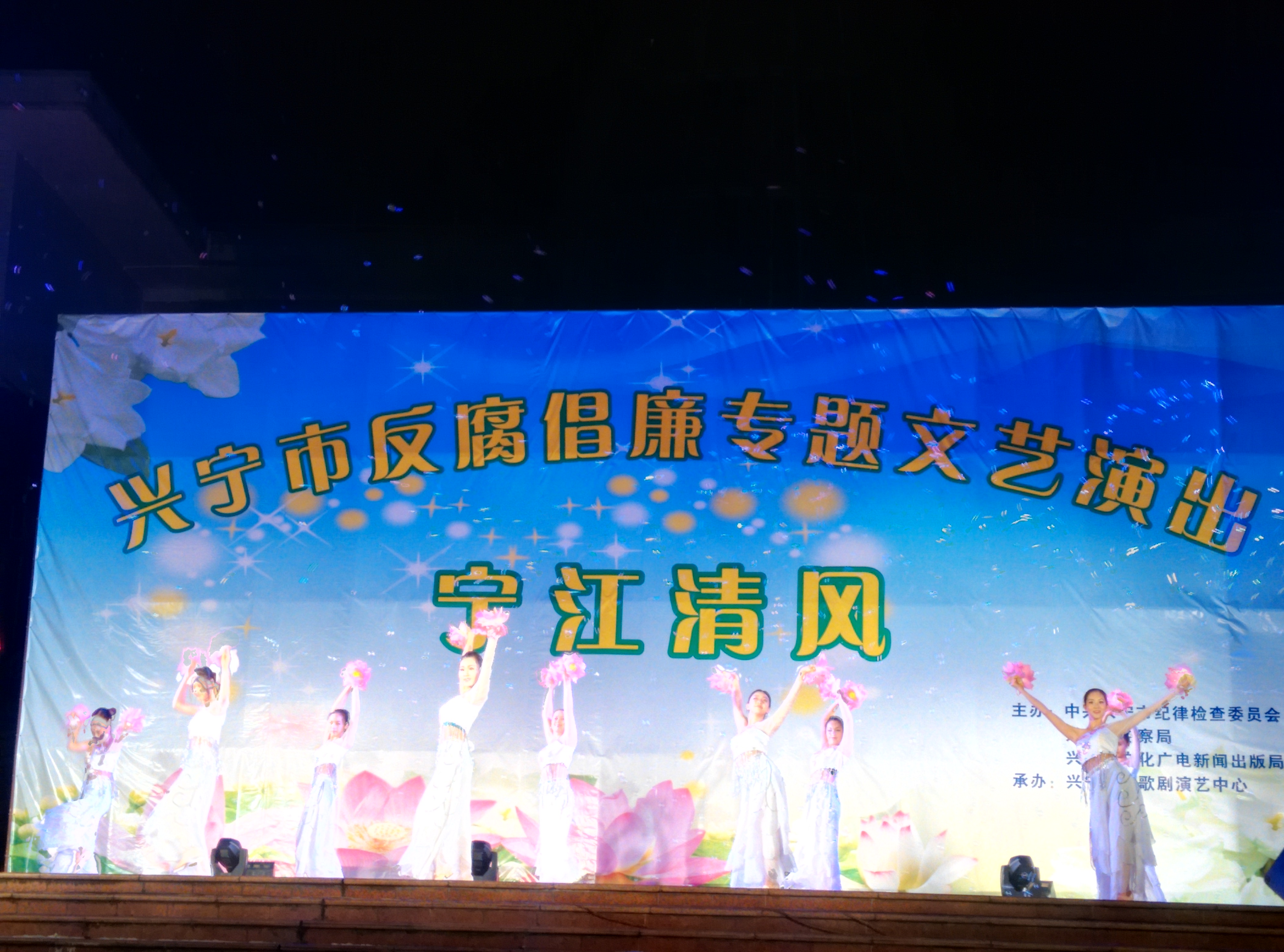 8月20日晚,由市紀(jì)委、監(jiān)察局、文廣新局聯(lián)合主辦,山歌劇團(tuán)承辦的“寧江清風(fēng)”反腐倡廉專題文藝晚會在文化廣場隆重上演。市領(lǐng)導(dǎo)劉銳清、藍(lán)新環(huán)、袁勇華同群眾一起觀看了晚會。晚會在一首大氣磅礴的歌曲《中國夢》中拉開序幕,隨后,歌舞、古箏、山歌、小品等十多個精彩節(jié)目紛紛上演。其中,舞蹈《荷風(fēng)晨露》伴隨著激揚(yáng)振奮的音樂,反映出荷花潔身自好,出淤泥而不染的風(fēng)骨;小品《同學(xué)會》則通過詼諧幽默的藝術(shù)形式對貪污腐敗現(xiàn)象進(jìn)行諷刺,引得在場觀眾發(fā)出陣陣歡笑和喝彩;快板表演唱《說一說來唱一唱》則用歡快活潑的形式展現(xiàn)了當(dāng)前我市反腐倡廉工作取得的成效,并告誡廣大干部在工作和生活中要修身慎行,清廉自律。