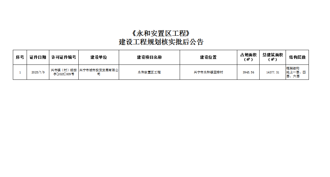 《永和安置區(qū)工程》建設(shè)工程規(guī)劃核實(shí)批后公告