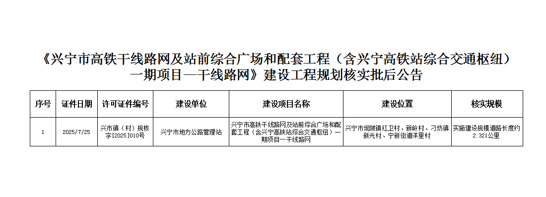 《興寧市高鐵干線路網(wǎng)及站前綜合廣場(chǎng)和配套工程(含興寧高鐵站綜合交通樞紐)一期項(xiàng)目--干線路網(wǎng)》建設(shè)工程規(guī)劃核實(shí)批后公告