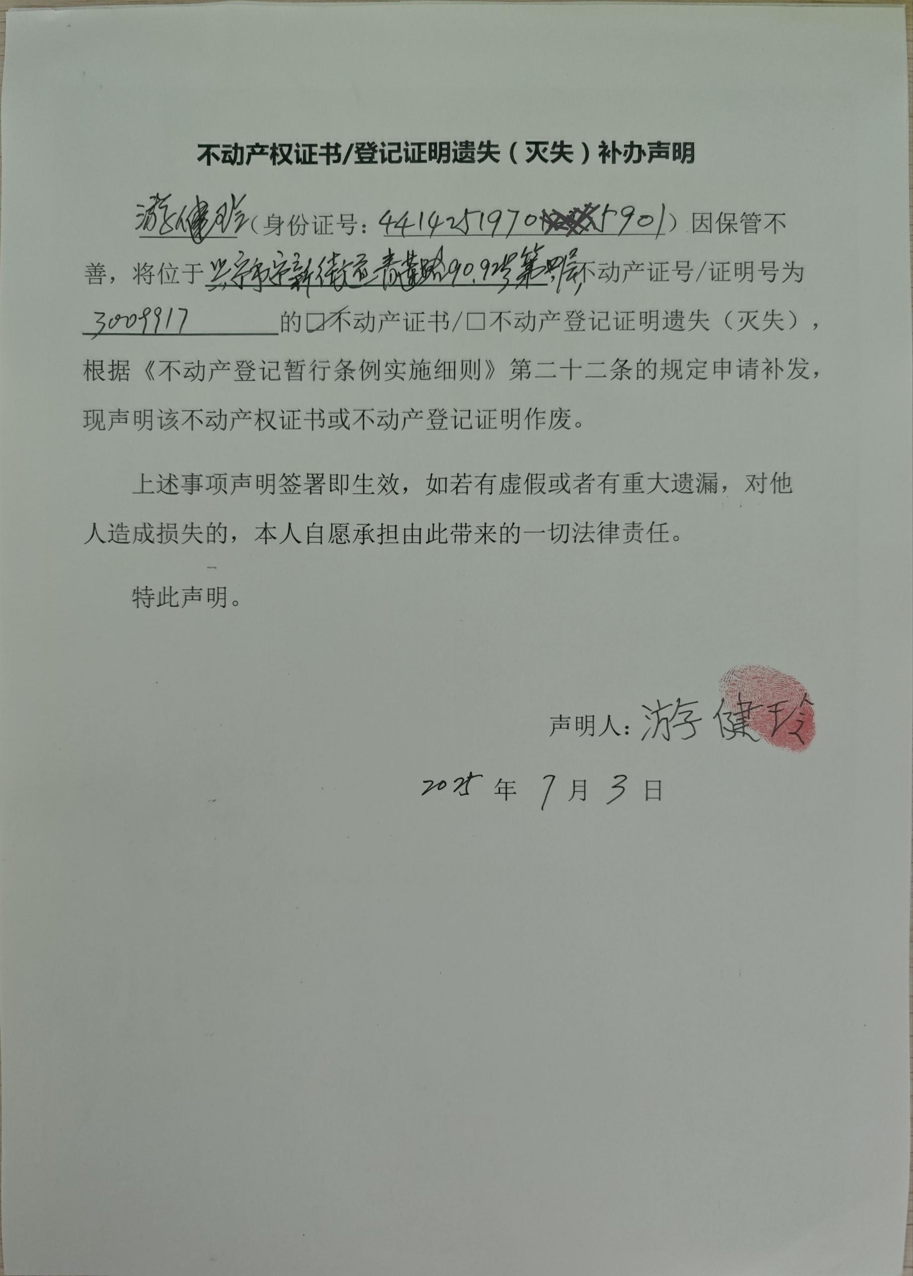 不動產(chǎn)權(quán)證書/登記證明遺失(滅失)補辦聲明