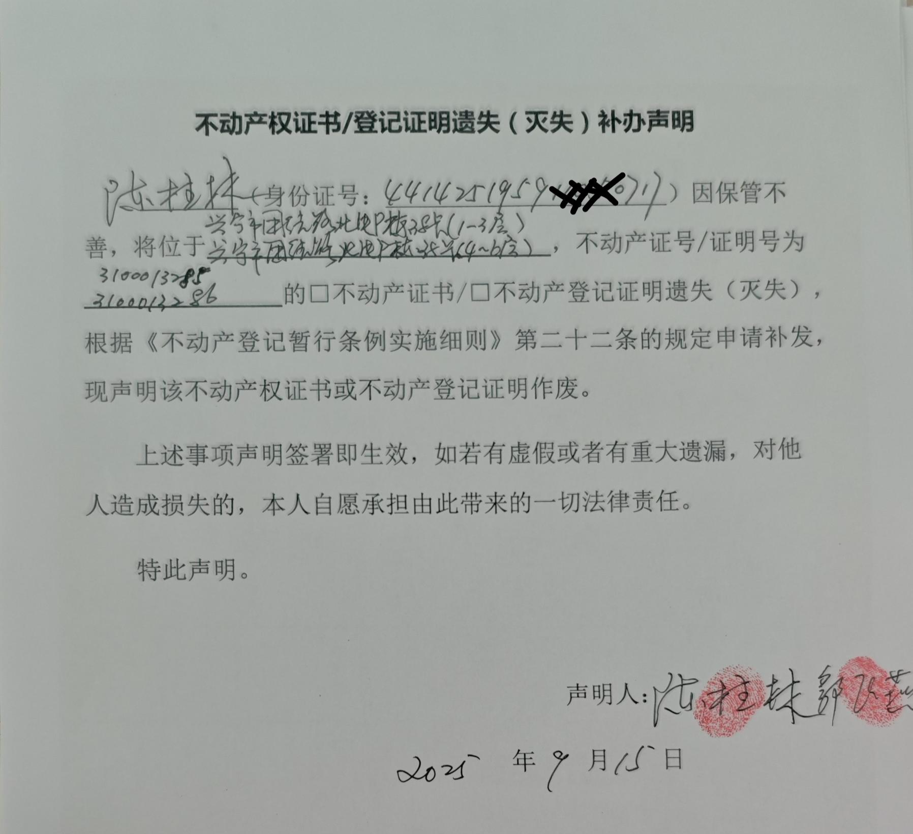 不動(dòng)產(chǎn)權(quán)證書/登記證明遺失(滅失)補(bǔ)辦聲明