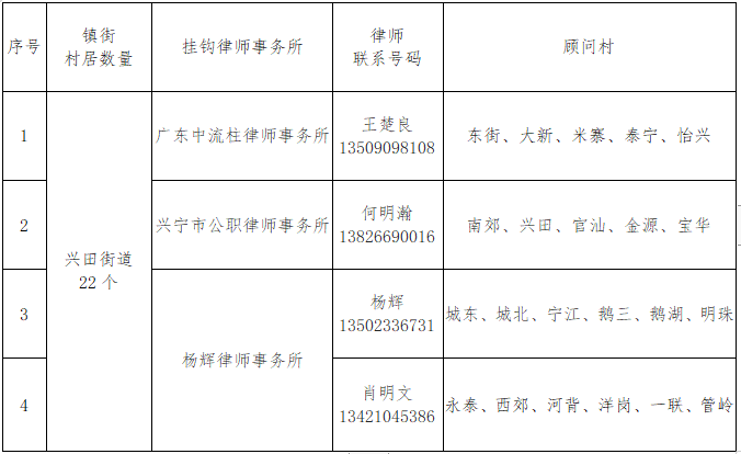 為認(rèn)真貫徹落實(shí)廣東省關(guān)于一村(社區(qū))一法律顧問(wèn)工作的要求,充分發(fā)揮廣大村(社區(qū))法律顧問(wèn)為群眾提供優(yōu)質(zhì)高效法律服務(wù)的作用,現(xiàn)將2024年度興寧市興田街道22個(gè)村(社區(qū))法律顧問(wèn)名單公布如下: