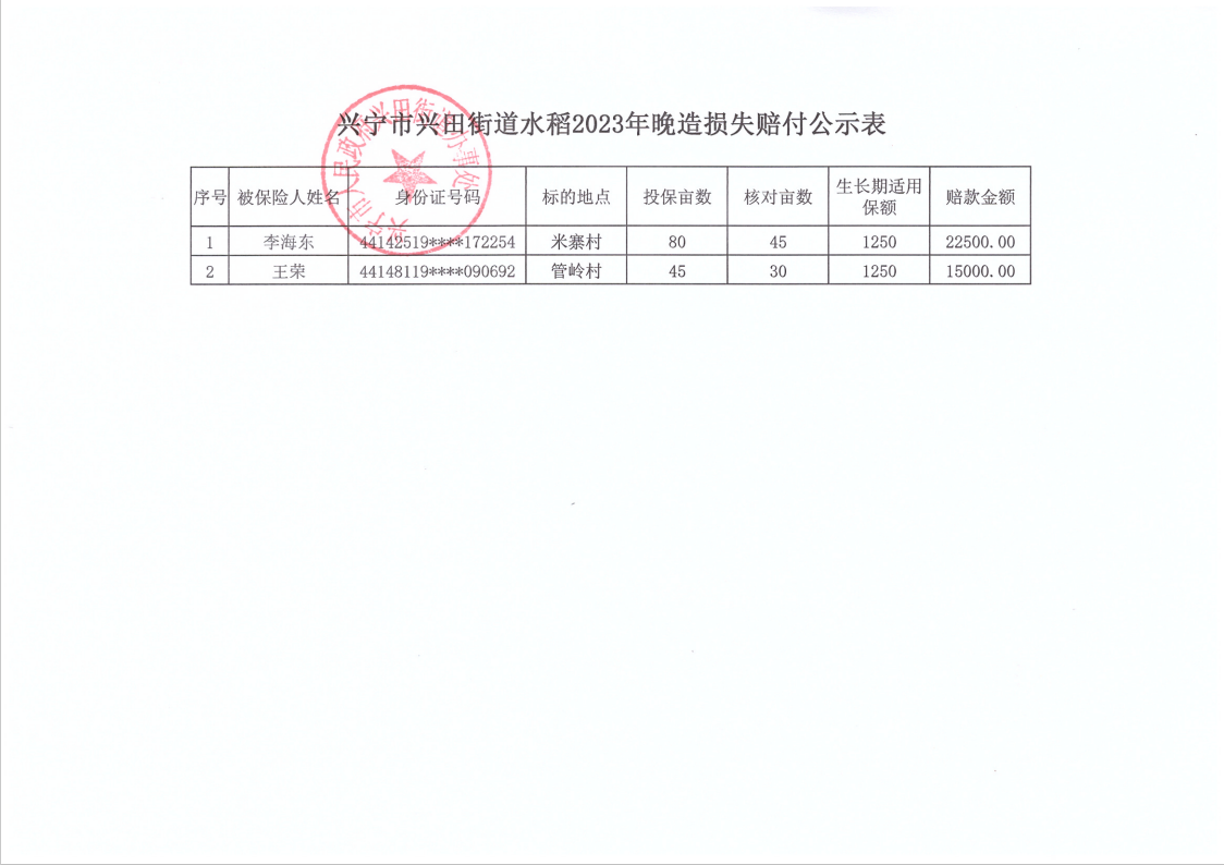 興寧市興田街道水稻2023年晚造損失賠付公示表