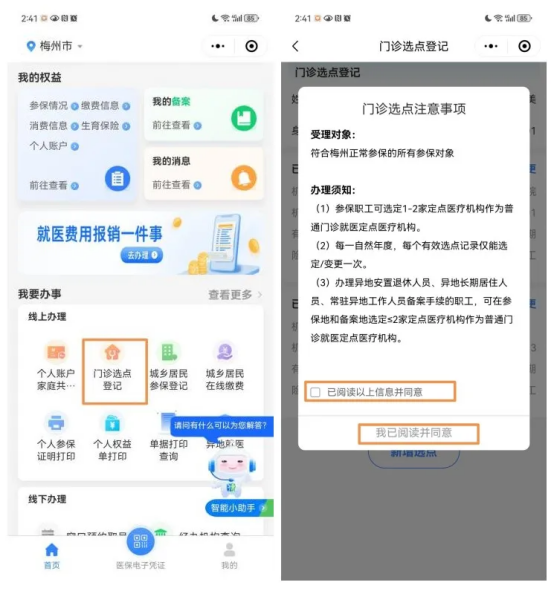 進(jìn)入“粵醫(yī)?!?/strong>主界面的“我要辦事”,進(jìn)入“門診選點(diǎn)登記”,勾選“已閱讀以上信息并同意”,點(diǎn)擊“我已閱讀并同意”,進(jìn)入“門診選點(diǎn)登記”。