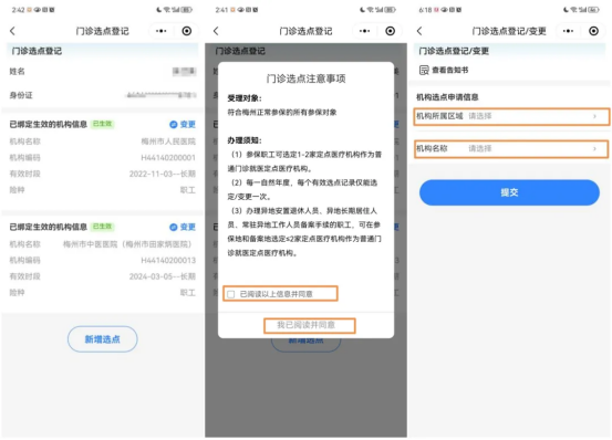 在“門診選點(diǎn)登記”頁面,對(duì)需要變更的定點(diǎn)醫(yī)療機(jī)構(gòu)的右上角點(diǎn)擊“變更”后,再次勾選“已閱讀以上信息并同意”,點(diǎn)擊“我已閱讀并同意”后,選擇“機(jī)構(gòu)所屬區(qū)域”、“機(jī)構(gòu)名稱”后提交即可。